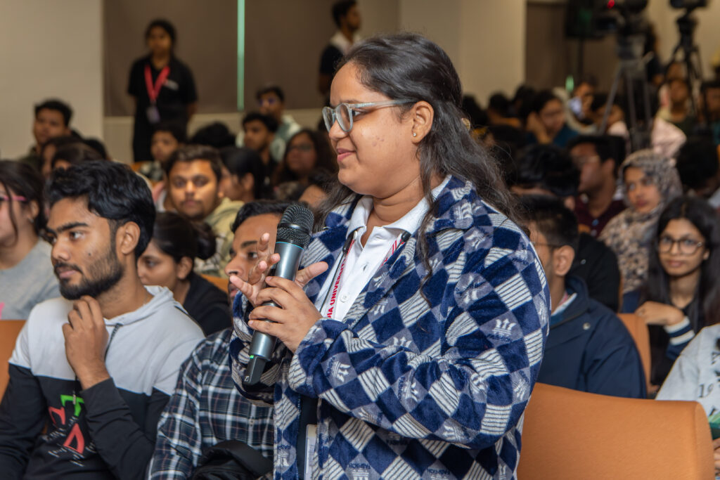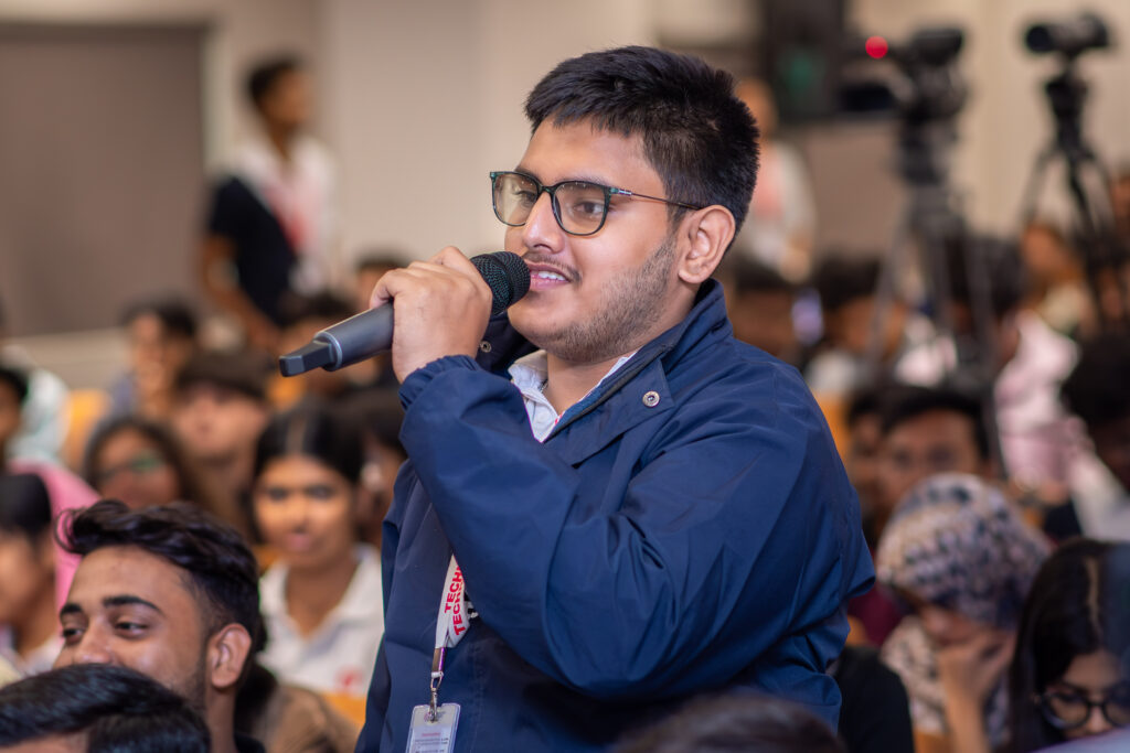 The discussion soon shifted toward the evolving mindset of today’s youth—a generation accustomed to instant results and rapid digital consumption. Meghdut raised thoughtful points about the pressures and distractions of the modern world, prompting Prof. Chaudhuri to remark, “Young people today want everything immediately, but real growth takes time. You cannot pre-encash your future just because the present feels slow.”