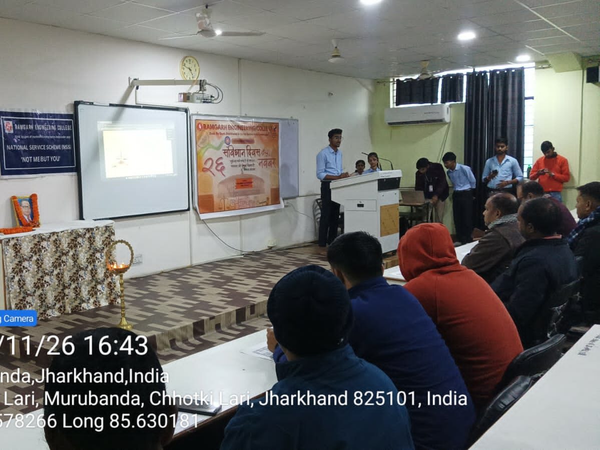 The event concluded with a formal vote of thanks, acknowledging the efforts of the NSS volunteers, faculty, and participants. The closing remarks left students with a renewed sense of pride and responsibility towards the nation’s constitutional vision. The programme not only celebrated a day of national importance but also reinforced the college’s dedication to nurturing socially aware, value-driven, and responsible young citizens. Through initiatives like this, Ramgarh Engineering College continues to inspire students to uphold the spirit of the Constitution in their thoughts, actions, and contributions to society.