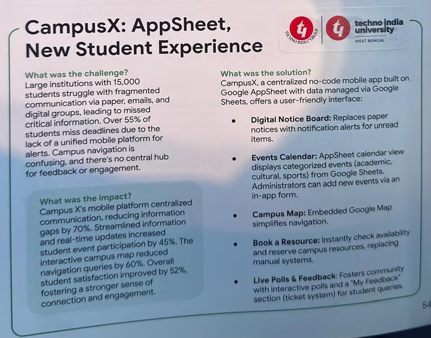 With more than 15,000 students, Techno India University recognized the need for a unified communication platform—one that could bring together notices, event updates, feedback systems, and navigation tools under one seamless interface. This challenge gave rise to CampusX, a no-code mobile solution developed using AppSheet and powered by Google Sheets.