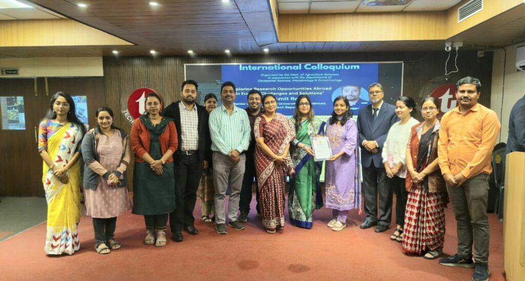Organized by the Department of Agriculture Sciences in association with the Departments of Geospatial Science, Microbiology, and Biotechnology, the colloquium brought together academicians, researchers, students, and distinguished experts from India and abroad. The inaugural session was graced by senior university leadership, including Prof. Dr. Gautam Sengupta, Rector, Prof. Dr. Samiran Chattopadhyay, Vice Chancellor, Prof. Dr. Gautam Majumdar, Pro–Vice Chancellor, Prof. Dr. Rina Paladhi, Director (Academics), and Prof. Dr. Sujoy Biswas, Registrar, TIU and CEO, Techno India Group.