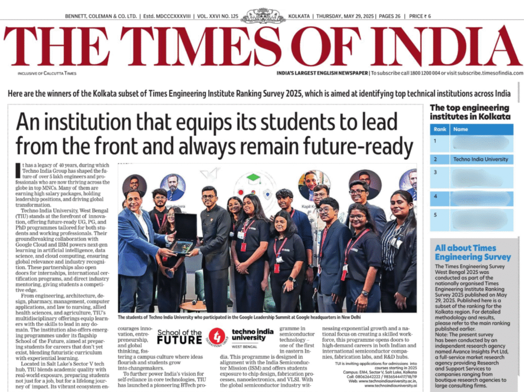 Techno India University secured 2nd position among Kolkata’s Top Engineering Institutes in the Times Engineering Institute Ranking Survey 2025. The recognition by The Times of India reflects TIU’s strong academic framework, industry collaboration, and commitment to innovation, quality education, and future-ready learning.