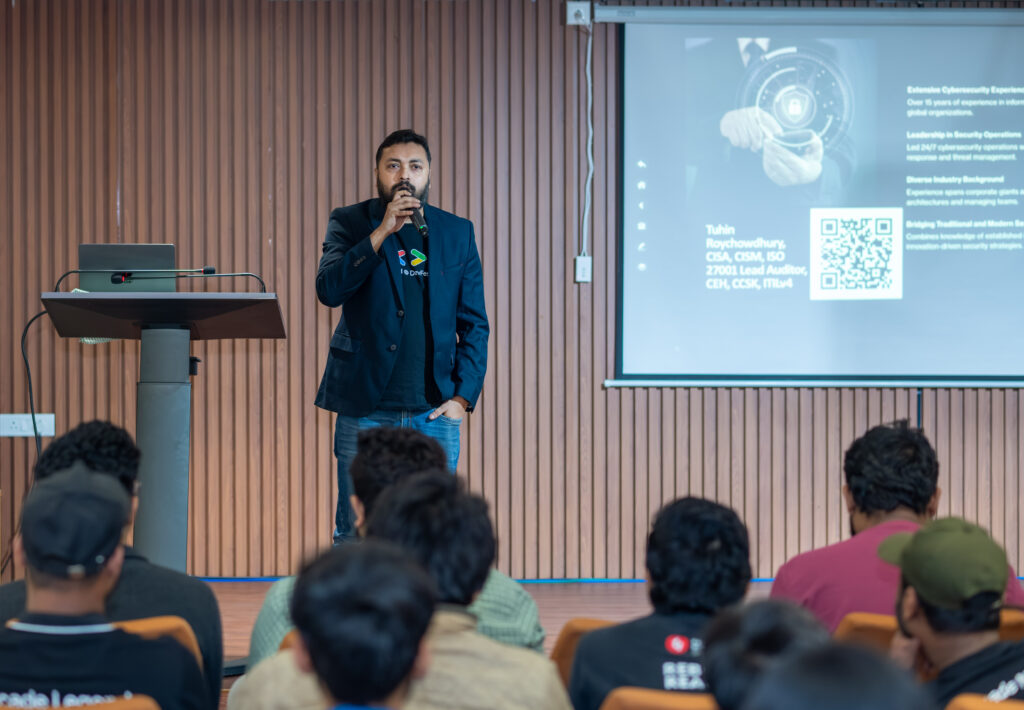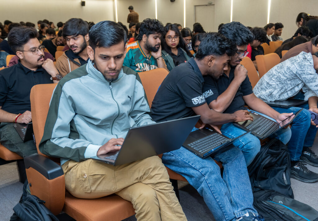 Cybersecurity took center stage during Tuhin Roychowdhurys session, where he emphasized the importance of ethical responsibility in an AI-driven world. Encouraging students to use their skills wisely, he stated, “If you can break a system, you must also know how to protect it….” and advised, “Choose to be an ethical hacker, not a black hat hacker… your skills should defend, not destroy…..”