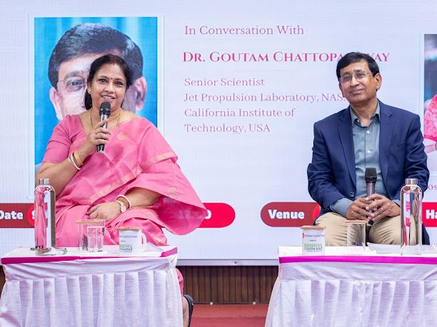 The conversation began with Prof. RoyChowdhury sharing the fascinating story of how she first met Dr. Goutam Chattopadhyay—a meeting that felt almost serendipitous. Recalling the moment, she said, “I believe in the Almighty…” I was returning from a program at Delhi University, and the seat beside me in the flight was vacant. What initially appeared to be a simple coincidence soon turned into an engaging exchange when the person who occupied the seat introduced himself as Dr. Goutam Chattopadhyay. As their conversation unfolded during the flight, he spoke about his journey in space science and mentioned that he had spent over two decades working with NASA, contributing to research that explores the mysteries of the universe.