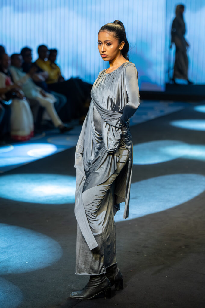 A defining aspect of the collection was its commitment to sustainability. Every design in Fluidal Motion was created through upcycling, where discarded fabrics were reimagined into contemporary fashion pieces. This approach highlighted the students’ awareness of the growing importance of sustainable and responsible fashion, showing how innovation and environmental consciousness can coexist in modern design practices.