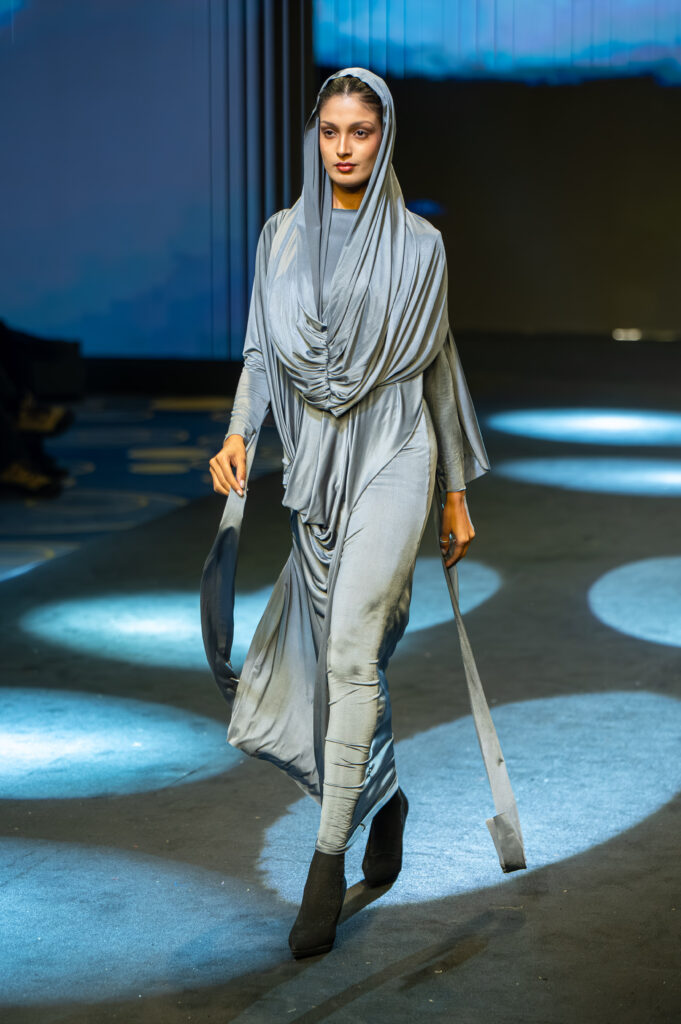 The collection featured draped silhouettes, layered textures, and asymmetrical cuts, creating garments that responded naturally to movement. Each piece demonstrated a thoughtful balance between structure and fluidity, allowing the designs to reflect individuality while maintaining a strong aesthetic presence on the runway. The garments seemed to come alive as models walked, emphasizing the theme of fluid transformation.
