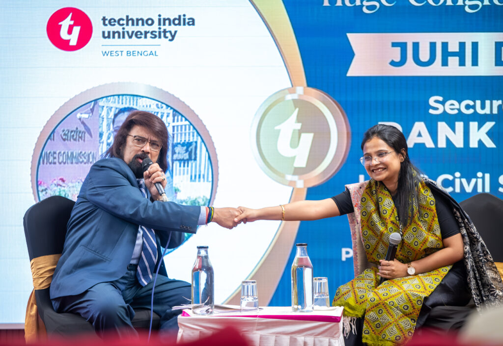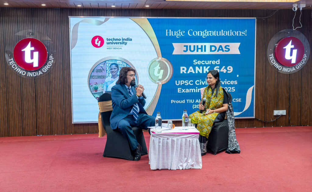 An engaging interactive session between Juhi Das and Prof. Dr. Sujoy Biswas, Registrar, TIU and CEO, Techno India Group, was held during the event, where Juhi shared insights into her UPSC preparation journey. She spoke about the challenges she faced, the discipline required during preparation, and the personal struggles that shaped her path to success.