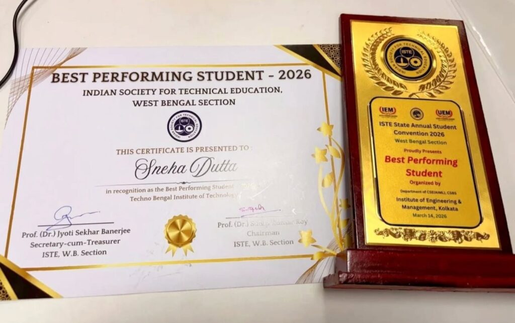 Techno Bengal Institute of Technology (TBIT), a part of the Techno India Group, celebrates the outstanding achievement of Ms. Sneha Dutta, a 4th-year student of Computer Science and Engineering (AI & ML), who has been honoured with the prestigious “Best Performing Student for the Year 2026.”