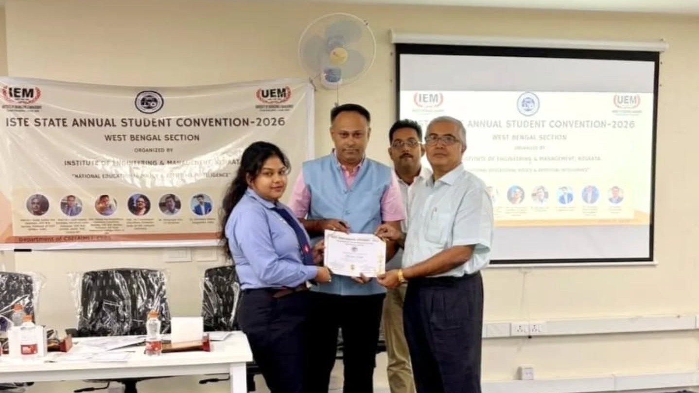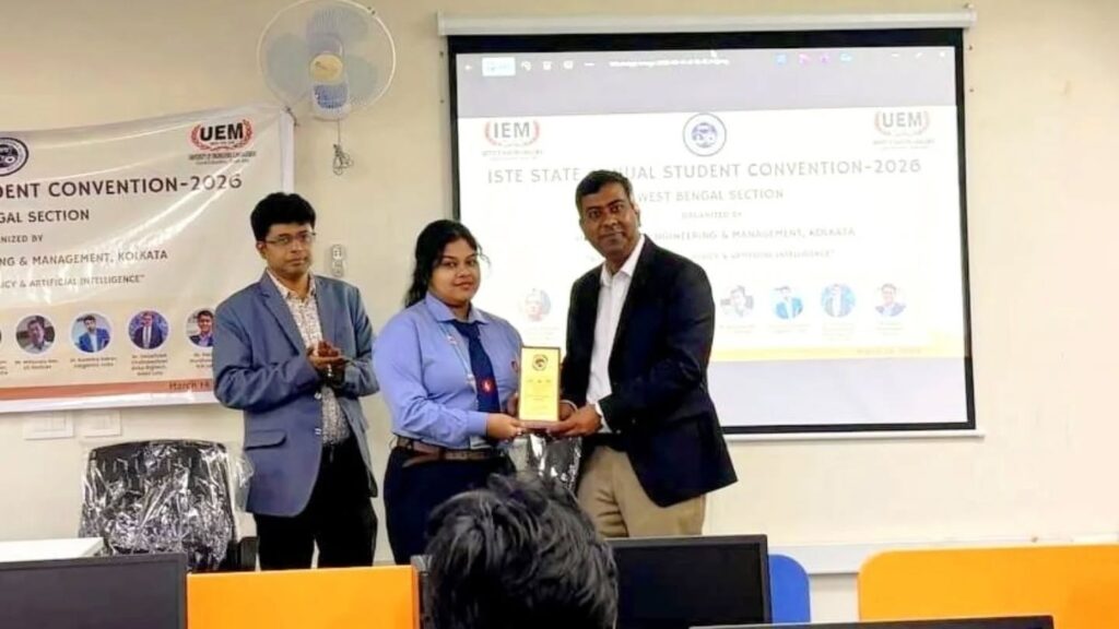 She received this recognition at the ISTE WB Section State Student Convention held on March 14, 2026, at the esteemed IIT Kharagpur Research Park. The event brought together some of the most promising students and academic leaders from across West Bengal, making Sneha’s achievement even more noteworthy.