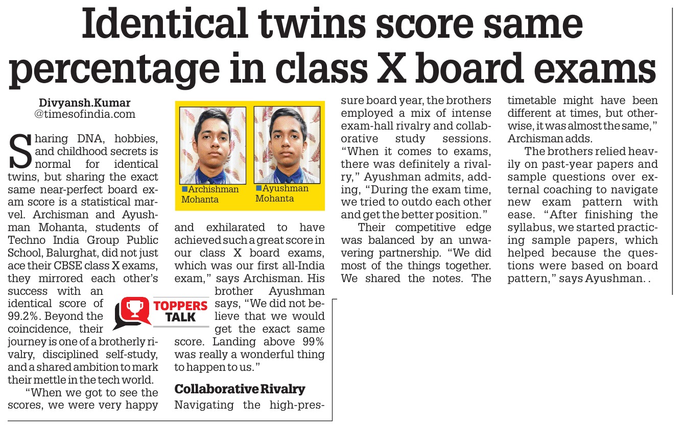 In an extraordinary yet heartwarming academic feat, identical twins Archishman and Ayushman Mohanta of Techno India Group Public School, Balurghat secured the exact same percentage – 99.2% – in their Class X board examinations. While such a coincidence may seem almost unbelievable, their journey reflects something far deeper than shared DNA, it tells a story of discipline, companionship, and a uniquely balanced approach to learning.