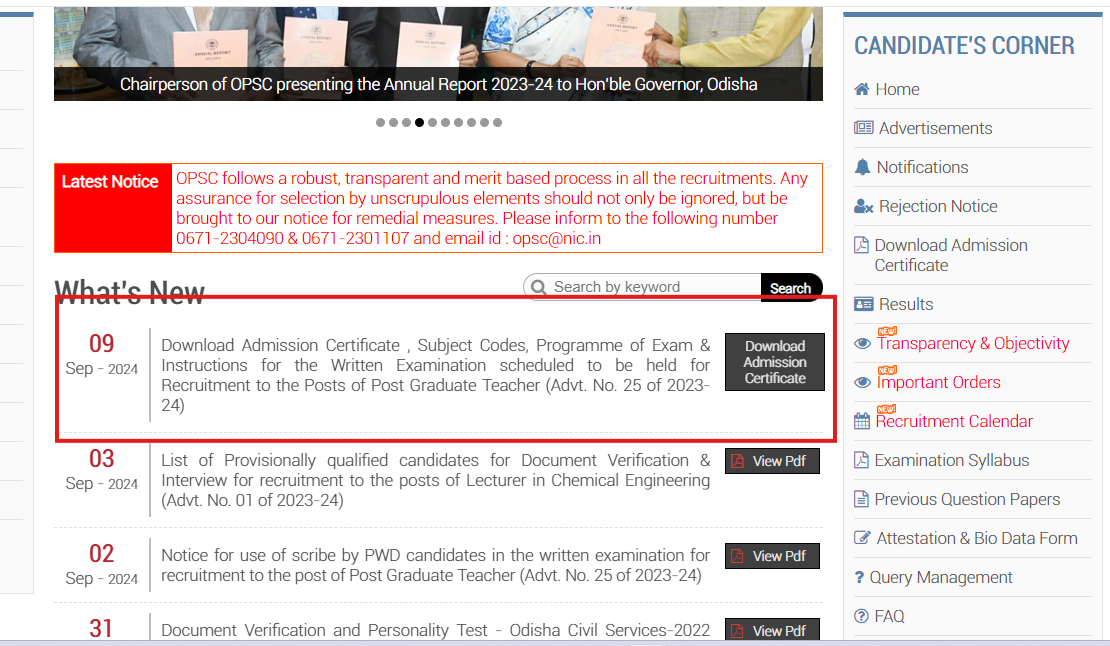 The Odisha Public Service Commission (OPSC) has released the 2024 admit cards for the Post Graduate Teacher (PGT) recruitment exam on its official website, opsc.gov.in. The exams will be held in Balasore, Berhampur, Bhubaneswar, Cuttack, and Sambalpur on September 15, September 29, and October 6, 2024, with three sessions each day. Candidates can download their admit cards by following the steps outlined on the OPSC website.
